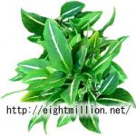 先端が尖る長楕円型の葉は、青白色をおびた薄い緑色で側脈に沿った濃いグリーンの斑が入って美しく、観葉植物として市販されています。
